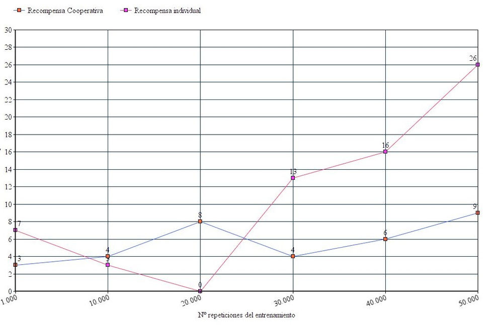 After the agent was created, I trained it during 50,000 games and I made an analysis with the data I retrieved from the training and different tests. The final results showed that after 30,000 games the agent started to improve its results considerably and it also reached a solution (catching the pig or going to the exit) more often as the training continued. This, along other data retrieved, proved that the agent learnt to play the game (it improves its score with training) and to collaborate (the more games it played, the collaborative solution of catching the pig with the other agent was achieved) only using the perceptions it received from the environment.